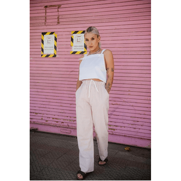 Pantalón estampado de líneas rosas y blancas, recto con pretina elasticada y bastilla.